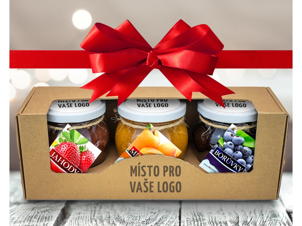 Firemní dárkové balíčky – originální české dárky plné chuti pro klienty i zaměstnance. Vaše logo na obalu zdarma – pošlete ho na info@skleniceplnaovoce.cz, nebo se vám ozveme po přijetí objednávky.